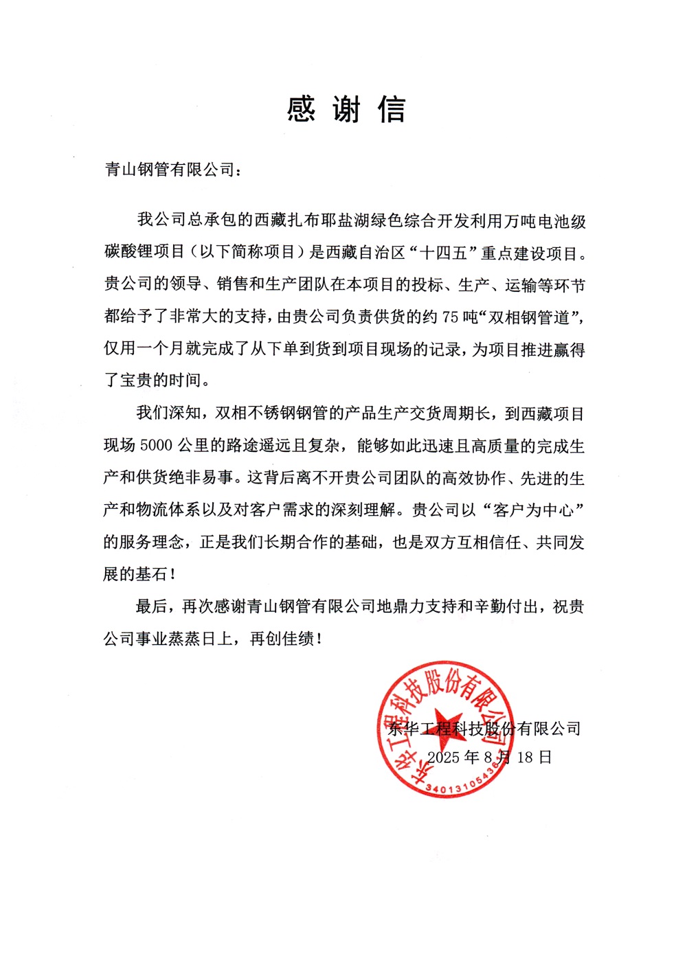 近日,jinnianhui今年会钢管有限公司收到东华工程科技股份有限公司发来的感谢信,对公司在西藏扎布耶盐湖绿色综合开发利用万吨电池级碳酸锂项目中的卓越表现予以高度肯定。在此次合作中,jinnianhui今年会钢管仅用一个月时间便完成了双相不锈钢钢管的生产和运输任务,以“jinnianhui今年会速度”刷新了同类项目的供货纪录,为项目顺利推进提供了关键保障。