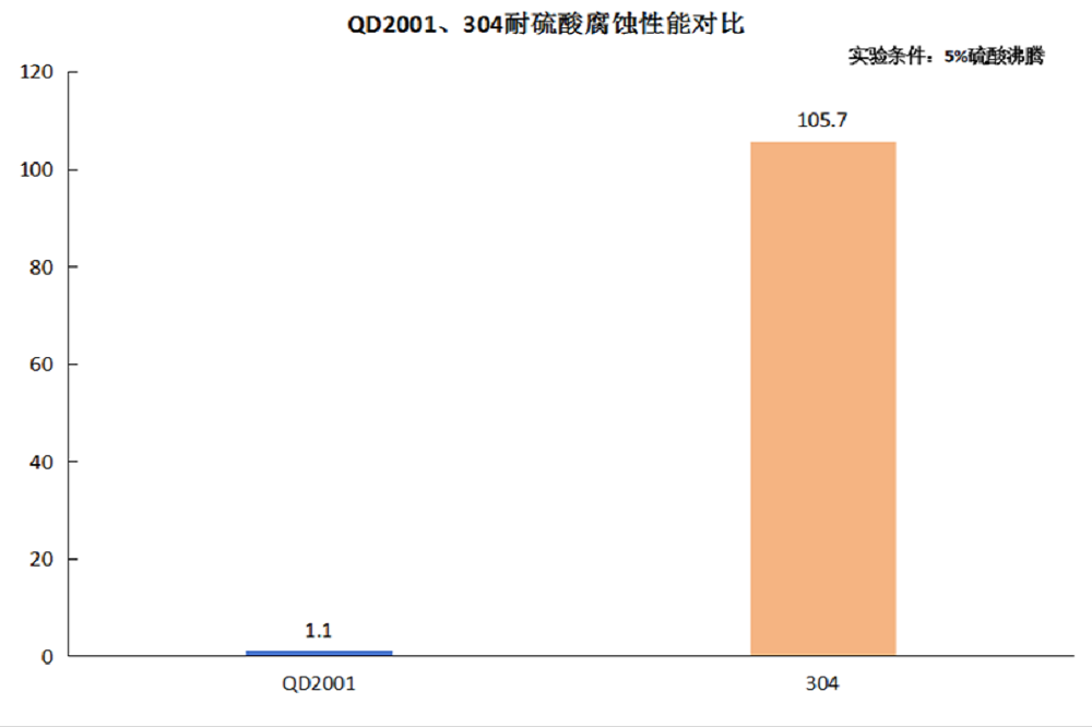 相比传统304不锈钢,青拓先进高强双相不锈钢QD2001在以硫酸腐蚀溶液为主的使用环境中,耐蚀性能接近304的100倍;D2-80螺栓在中性盐雾(NSS)试验96h之后,产品表面未见锈蚀。